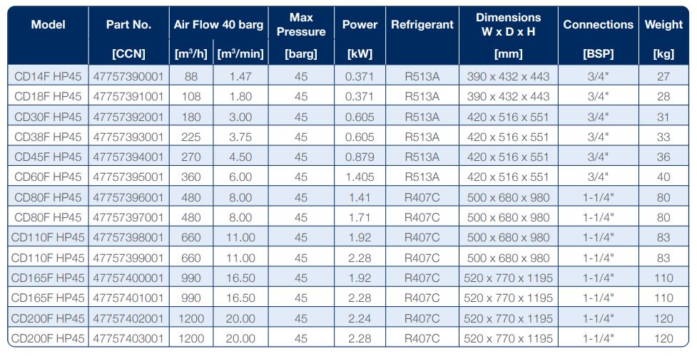 CompAir high-pressure refrigeration dryers deliver safe and constant quality, dry compressed air for various demanding environments such as PET bottle blowing, water jet cuts and aeronautical valves, in ambient temperatures of up to 50°C. Delivering consistent dew point control of +3°C for reliable and dry compressed air, this range of ten robust, compact and space-saving dryers provide maximum reliability at flow rates of between 88m3/h to 1,200m3/h (at a nominal pressure of 40 barg).